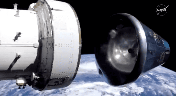 La cápsula con los cuatro astronautas de la misión, que orbitó la Luna en...