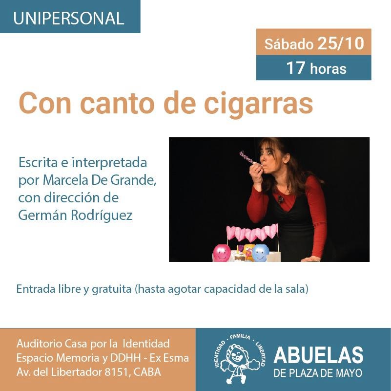 En el marco de la semana del 48º aniversario de Abuelas de Plaza de Mayo, este sábado 25 de octubre a las 17 se presentará en el Auditorio de la Casa por la Identidad, dentro del Espacio para la memoria y los derechos humanos que funciona en lo que fue la ESMA (avenida del Libertador 8151) la obra “Con canto de cigarras”, escrita e interpretada por Marcela De Grande y dirigida por Germán Rodríguez.